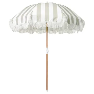 Boho Beach Umbrella with White Fringe - UPF 50+, Tilting Wood Pole, Sage Crew Stripe