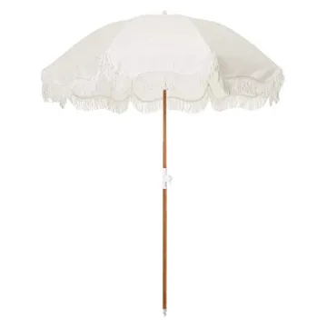 Show more Introducing the Holiday Umbrella, an enchanting addition to your summer outings! This boho beach umbrella features the signature white fringe that adds a vintage vibe to your beach setup, creating an ambiance that's both charming and inviting. Designed by the esteemed brand B&P Co., this umbrella combines functionality with exquisite style. With its lightweight construction, it's incredibly easy to carry for a day at the beach.