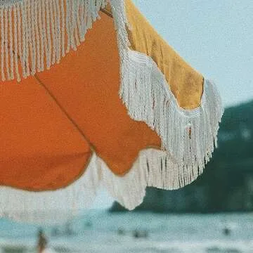 Show more Welcome the warmth of summer with the exquisite Business & Pleasure Co. Holiday Umbrella. This stunning boho beach umbrella effortlessly marries style and functionality, making it the ultimate accessory for any sun-soaked getaway. Measuring an impressive 5’ x 6.5’, it boasts a vintage gold hue adorned with the brand’s signature white fringe – a charming touch that imbues your beach setup with timeless elegance. The umbrella is constructed with UV resistant material and features a 1" tilting wood pole, offering not only robust support but also the flexibility to adjust for optimal shade as the sun moves throughout the day. With high-quality craftsmanship and a design that echoes bohemian allure, this umbrella is compact enough to be your perfect travel companion, ensuring you can soak up sun safely wherever you go.