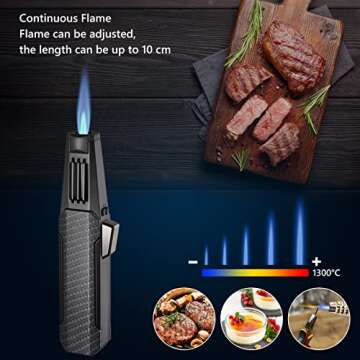 Show moreExperience the culinary thrill with the Butane Torch Lighter HGT-198, an upgraded refillable kitchen cooking tool designed for chefs and food enthusiasts! Crafted from durable zinc alloy and high-quality plastic, this torch combines functionality and reliability. Featuring a safety lock to prevent accidental ignition, high-temperature resistant nozzles, and ceramic insulation sleeves, this torch lighter is built to last, providing safety without compromising performance. Reach cooking temperatures of up to 1300 degrees with a continuous flame length of up to 10cm, making it perfect for various culinary tasks from gourmet desserts to outdoor grilling!