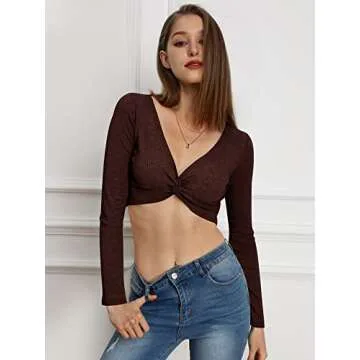 Elevate your autumn wardrobe with the Butgood Women’s V Neck Long Sleeve Crop Top. Perfectly blending style and comfort, this shirt features a flattering v-neckline and a chic twist knot front that enhances your silhouette and makes a bold statement. The long sleeves offer just the right amount of warmth for fall outings, while the cute cropped design ensures you stay trendy. Available in a rich brown hue, this top is versatile enough for casual gatherings or a night out.