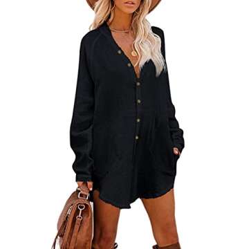 Button Down Tunic for Women Long Sleeve V Neck Blouse Shirt with Frayed Trim Relaxed Fit