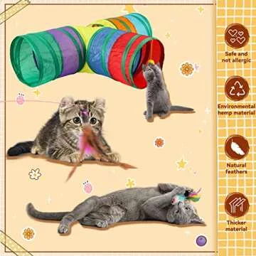 Show more Introducing the BWOGUE 22PCS Cat Toys Kitten Toys Set, a complete play package designed to ignite your pet's natural curiosity and playfulness! This expansive variety set includes an array of toys tailored for cats, ensuring hours of entertainment and mental stimulation. The star of the show is the rainbow cat tunnel, featuring a unique three-way design that allows your playful kitten to explore, dash, and hide, all while enticing them to engage their instincts. Made from ultra-strong and tear-resistant polyester, this tunnel is durable enough to withstand even the most energetic cats.