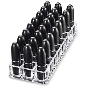 Show more Introducing the ultimate in beauty organization – the elegant lipstick holder by ALEGORY! This stunning makeup organizer is meticulously DESIGNED to fit standard-sized lipsticks, allowing you to showcase your beauty collection with grace. Crafted from a single piece of premium crystalline acrylic, this holder embodies both durability and sophistication, eliminating worries about glued parts falling apart. With dimensions of 8.6L x 3.5W x 1.18H inches, it conveniently fits into your makeup drawer while each cube boasts a width of .85 inches – perfectly sized to accommodate 24 individual lip products.