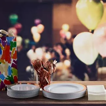 By Madee HEAVYWEIGHT 100 PC White and Rose Gold Plastic Plates for Party for 50 Guests | Mix and Match 50 Dinner Plates & 50 Dessert Plates | Rose Gold Party Plates | High End Disposable Plates