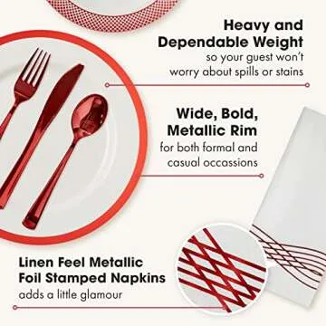Show more Elevate your next event with the By Madee High-End 175 Piece Disposable Dinnerware Set, designed for those who believe in combining style and convenience. This all-in-one fancy disposable dinnerware set includes everything you need to host up to 25 guests effortlessly, featuring 25 dinner plates, 25 dessert plates, 50 forks, 25 knives, 25 spoons, and 25 chic linen-feel napkins adorned with striking metallic foil stamping. Each element of this set is crafted to add a touch of elegance to any celebration, from intimate gatherings to grand celebrations, ensuring your table looks breathtaking without the hassle of traditional cleanup.