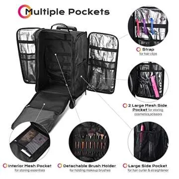 BYOOTIQUE Rolling Makeup Train Case Soft Sided Makeup Storage Cosmetic Organizer Carry on Travel Trolley Suitcase with Heat Isolation Side Pocket 6 Removable Bag for Makeup Artist Hairstylist, Black