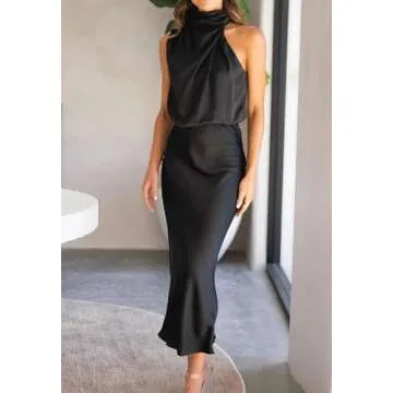 BZSFW Women's 2024 Summer Satin Dress Elegant Sleeveless Mock Neck Cocktail Party Maxi Dresses (Black, Medium)