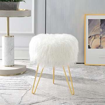 C COMFORTLAND Fur Fuzzy Bedroom Stool for Vanity Desk, Small Fluffy Makeup Chair for Dressing Table, Furry Round Ottoman Foot Stool for Bathroom, Living Room, Kids Room White