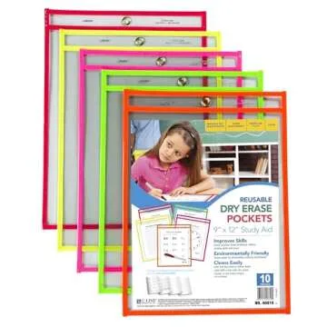 C-Line Reusable Dry Erase Pockets, 9 x 12 Inches, Assorted Neon Colors, 10 Pockets per Pack (40810)
