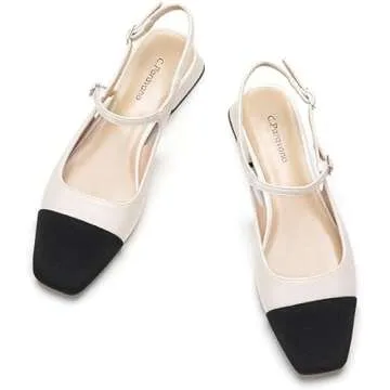 C.Paravano Women's Slingback Flats | Square Toe Slingback Flats for Women | Block Heel Slingback Sandals | Adjustable Ankle Strap Shoes(Size 9,White)