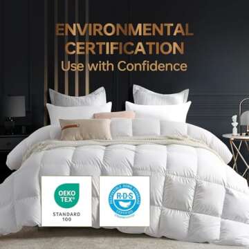 Show more Experience the ultimate in comfort and warmth with the C&W White Goose Down Comforter King Size. Designed to be fluffy yet lightweight, this luxurious down comforter is perfect for cold winter nights. With an impressive dimensions of 106 x 90 inches and a generous fill weight of 60 oz, it expertly offers insulation and breathability without the concern of overheating. Crafted from responsibly sourced, high-loft down and feather filling (90% down, 10% feathers) and certified by Responsible Down Standard (RDS), this comforter provides a cozy, cloud-like feel that will transform your sleeping experience. Say goodbye to restless nights and wake up refreshed and revitalized with the warmth and comfort of this exquisite duvet insert.