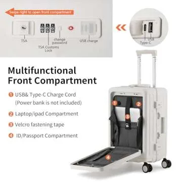 CAARANY Carry on Luggage 22x14x9 Airline Approved, PC Lightweight Hardside Suitcase with Spinner Wheels, Front Pocket, USB Port, Cup Holder and Aluminum Frame, White, 20-Inch