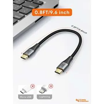 Show more Discover the perfect solution for your charging and data sync needs with the CableCreation Short USB C to USB C Cable. This compact 0.8FT cable is designed to provide a seamless experience for anyone who values efficiency and quality in a fast-paced world. With a thoughtful design that compliments your mobile life, this cable ensures your devices stay charged without the hassle of tangled cords. Crafted with a double-braided exterior and premium materials, the cable’s durability is unmatched, providing a tested 10,000+ bend lifespan.