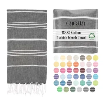Show more Introducing the Cacala Lightweight and Thin Turkish Beach Towel, an exquisite blend of elegance and practicality, crafted from **100% Turkish cotton**. Offering a generous size of **37 x 70 inches**, this towel stands out for its **unmatched softness** and **superb absorbency**, making it a **must-have accessory** for beach lovers and anyone seeking a touch of luxury in their daily routine. Designed with versatility in mind, this towel effortlessly transitions from being a stylish beach cover-up to a cozy picnic blanket or even a fashionable shawl. Enjoy the rich heritage of Turkish craftsmanship that guarantees durability while still embracing a lightweight texture.