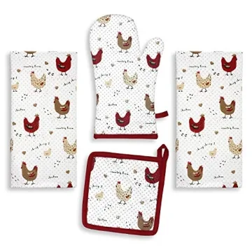 The charming chicken-themed designs and the inclusion of both an oven mitt and potholder set this apart.