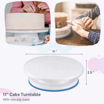 The centerpiece of this kit is the revolving cake decorating turntable, featuring a secure non-slip base for enhanced stability while decorating. Capable of handling cakes up to 11 inches, this turntable allows you to achieve that perfect finish with effortless 360-degree rotation. Whether you're spreading icing or piping intricate designs, creating a stunning cake has never been so seamless.
