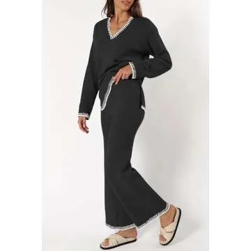 Show moreStep into the world of ultimate comfort and trendsetting style with the **Cakulo Women's 2 Piece Lounge Set**—an essential addition to your wardrobe for Fall 2024! Crafted from **premium soft knit material**, this fashionable loungewear set includes a chic pullover top and stylish wide-leg pants, perfect for the modern woman who seeks both elegance and practicality. The pullover features a beautifully designed **V-neckline with white contrast stitching**, giving it a distinct flair that elevates casual wear. Coupled with a relaxed, loose fit and drop shoulder styling, this outfit will have you looking effortlessly put together, whether lounging at home or enjoying a day out on the town.