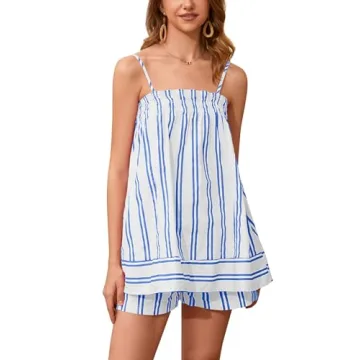 Show moreIntroducing the Calbatic Women’s 2 Piece Lounge Set – your perfect companion for summer lounging and fashionable outings! Designed with your comfort in mind, this striped summer pajama set features a stunning combination of a sleeveless peplum cami top and wide-leg shorts, making it a versatile addition to your wardrobe. Made from high-quality 100% cotton, this outfit ensures maximum breathability and lightweight comfort, allowing you to enjoy those warm sunny days without any fuss.