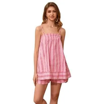 calbatic Women 2 Piece Lounge Set Striped Summer Pajama Set Sleeveless Peplum Cami Top and Wide Leg Shorts Set Beachwear Pink
