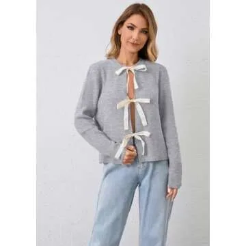 calbatic Women Long Sleeve Bow Tie Front Cardigan Sweater Open Front Knit Pullover Tops Casual 2024 Fall Winter Grey