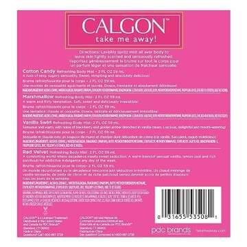 Show moreExperience the enchanting fragrance journey with the Calgon Take Me Away 4 Pc Gift Set. Each set includes Refreshing Body Mist in dual delectable scents: Cotton Candy Marsh Mallow and Red Velvet. Designed by the esteemed fashion house of Calgon, this gift set captivates the senses and transforms daily rituals into moments of sweet indulgence.