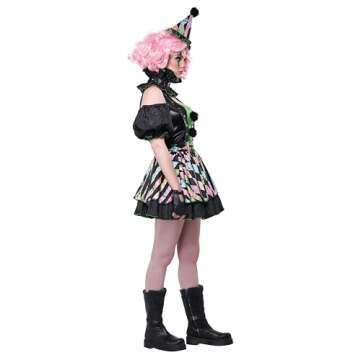 Show moreStep into a whimsical world with the California Costumes Sweet But Psycho Adult Large outfit, where fun meets flair. This ensemble is perfect for those who want to showcase a playful yet edgy side at any costume party or themed event. It includes everything you need to make a striking statement: a charming dress adorned with puff sleeves and cheeky pom poms, a layered overskirt that adds delightful volume, a frilled collar to accentuate your neckline, and suspenders for that extra touch of playful fun. Completing the look is a clown hat nestled on a comfortable headband, ensuring you’re ready to shine all night long!