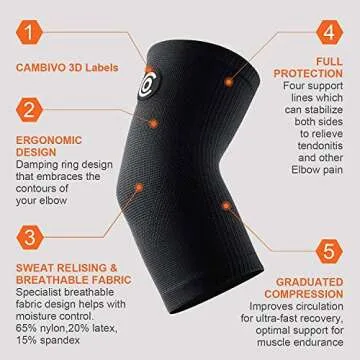 Show moreIntroducing the CAMBIVO Elbow Support, your ultimate companion for not just fitness but for daily life! These elbow compression sleeves are engineered to provide the perfect amount of compression that significantly enhances blood circulation, effectively relieving symptoms associated with joint inflammation, tendonitis, and conditions like tennis and golf elbow. Whether you're an athlete performing rigorous movements or someone whose job demands repetitive arm motions—like cooks, therapists, or office workers—these sleeves are tailored for you, ensuring optimal support and functionality.