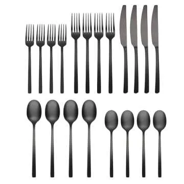 4 salad forks, 4 dinner forks, 4 dinner knives, 4 dinner spoons, and 4 teaspoons. Made from high-quality 18/0 stainless steel, this set not only delivers a striking black satin finish that enhances any table setting but also ensures durability and longevity, making it a valuable addition to your kitchen essentials.