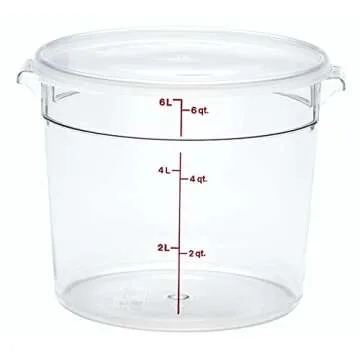 Show moreIntroducing the Cambro Food Storage Container - Round Series - 6 QT, a commercial-grade solution that transforms how you store and prepare food. Crafted from virtually unbreakable polycarbonate, this durable storage container is designed with both functionality and resilience in mind, ensuring it withstands the rigors of a busy kitchen. Its crystal-clear construction allows for easy identification of contents, so you will never have to play the guessing game when reaching for these containers. The container's exceptional stain and odor resistance ensures that even the most pungent foods won’t leave a trace behind, keeping the container pristine and ready for use.