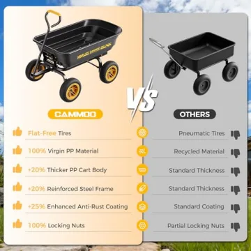 When placed alongside other garden carts in the market, the CAMMOO dump cart shines due to its combination of durability, design, and capacity. Many competitors may offer a similar load capacity, but few feature the innovative no-flat tire design that frees users from the headache of flat tires. The materials used in construction are notably superior, employing 100% virgin polypropylene that ensures long-lasting wear compared to recycled alternatives. Moreover, the easy maneuverability and unique dumping feature add unparalleled convenience that many rivals lack. Ultimately, the CAMMOO cart is your best choice for effective outdoor work.