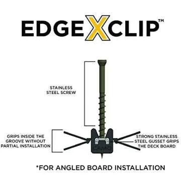Show moreDiscover the excellence of CAMO EDGEX™ Clip Hidden Deck Fasteners, designed meticulously for premium angled grooved deck installations. Crafted for use with a variety of materials including wood, composite, capped composite, and PVC, these fasteners ensure a solid and durable deck structure without compromising aesthetic appeal. The innovative one-pass fastening mechanism eliminates the hassle of partial installations, streamlining the construction process for both DIY enthusiasts and professional builders.