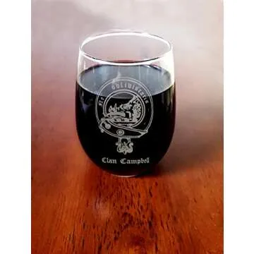 Campbell Scottish Clan Crest Clear Stemless Wine Glass 18 oz - Free Personalized Engraving, Celtic Decor, Scottish Wedding Glass