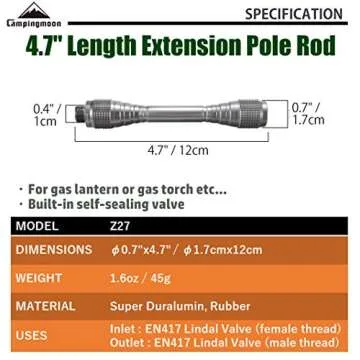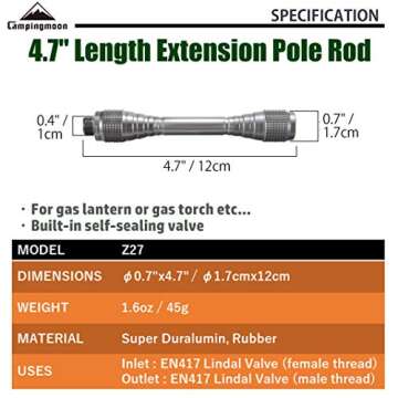 Introducing the CAMPINGMOON 4.7'' Length Extension Pole Rod for Camping Lantern Z27, the ultimate accessory for your camping experiences! This ingenious extension pole is designed to elevate your devices equipped with an EN417 Lindal Valve, such as gas lanterns or torches, providing just the right height for optimal illumination. Durable yet lightweight, this pole guarantees easy handling and enhanced safety during your outdoor adventures. Additionally, it measures an impressive 4.7 inches...