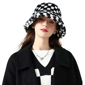 Show more Introducing the Campsis Winter Faux Bucket Hat, your ultimate companion for staying warm and stylish this winter! Made from high-quality polyester and plush, this bucket hat guarantees unparalleled softness, comfort, and a skin-friendly experience. With its lightweight and breathable design, it ensures that you stay cozy without feeling weighed down. Featuring a unique checkerboard pattern, this hat stands out effortlessly in any winter crowd.
