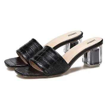 CAMSSOO Women's Square Toe Heeled Mule Sandal Open Toe Slip On Sexy Dress Wedding Backless Clear Chunky Block Heels Slides Slippers Black PU Size US 9