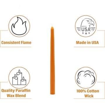 Show moreIlluminate your space with the exquisite CandleNScent Taper Candles. Crafted in the USA, these taper candles feature an advanced paraffin wax formulation that ensures a clean and steady flame, making them an ideal choice for both everyday use and special occasions. Measuring a full ten inches in height and designed with a special base, these orange unscented candles not only fit snugly in all standard candlesticks and glass holders but also provide a dramatic touch to your decor. Every burn reveals the beauty of their soft lighting, creating an inviting atmosphere in any setting.