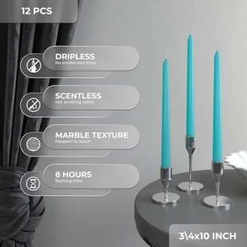 Show more Experience the enchanting allure of Candwax's teal blue taper candle set, a perfect blend of elegance and functionality. Transform your living space into a serene sanctuary with these luxurious 10-inch candles, known for their dripless and smokeless features. Each candle is meticulously crafted from high-quality colored wax, ensuring that the warm, inviting glow remains consistent and beautiful throughout its burn time of approximately 8 hours. Imagine hosting a dinner party or enjoying a soothing bath, with the flickering lights creating a captivating atmosphere all around you!