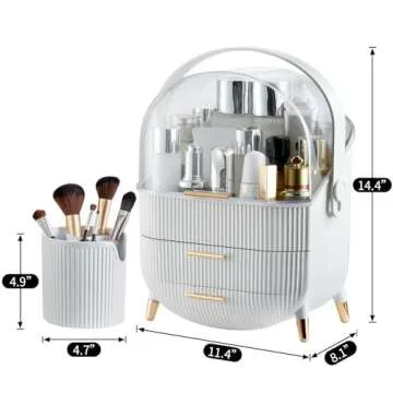 Show more Introducing the CANITORON Makeup Organizer, the perfect solution for all your makeup and skincare storage needs. With sleek dimensions measuring 11.4"L x 8.1"W x 14.4"H and a spacious brush holder of 4.7"L x 4.92"H, this organizer is designed to suit every beauty enthusiast. Its large capacity features two drawers and a top compartment, easily accommodating tall skincare bottles and an array of beauty products.