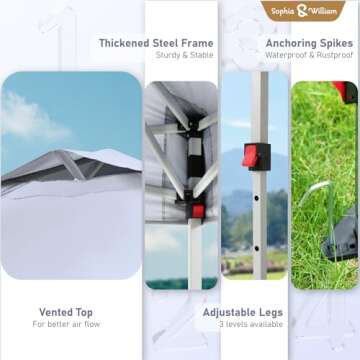 While there are many options on the market, Sophia & William's Canopy Tent stands out due to its exceptional combination of quality, ease of setup, and affordable price. Unlike many competitors, this tent features a thicker frame that ensures stability even in breezy conditions, as well as high-level UV protection and a vented top that enhances airflow. Many similar models do not provide these features or come with a roller bag for easy transport. Additionally, the generous 10x10 ft size covers a larger area, making it suitable for both small gatherings and larger events without compromising on performance.