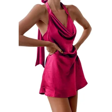 Embrace elegance and allure with the Cantonwalker Women's Cowl Neck Halterneck Slip On Backless Satin Mini Dress. Crafted from lightweight, small-stretchy satin fabric, this dress is designed to hug your curves in all the right places, offering a seamless blend of comfort and style. The adjustable halter neck and cowl neck design add a touch of sophistication, while the slip-on style ensures easy wear. Perfect for those unforgettable nights out, this rose red satin mini dress is lined in the bust for added...