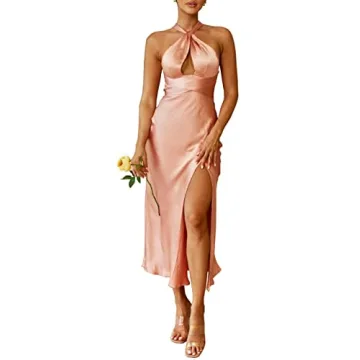 Show moreIntroducing the Cantonwalker Women's V Neck Halterneck Satin Front High Slit Wedding Guest Formal Midi Dress, the ultimate choice for those special occasions that call for elegance and sophistication. Crafted from premium satin, this dress features a stunning V neckline and a daring high slit design that beautifully enhances your silhouette. The blush color exudes a soft, romantic charm, making it an ideal selection for wedding guests and formal evening events. The halterneck style not only flatters your figure but also provides excellent support, allowing you to move with confidence and grace. With its combination of style and comfort, this midi dress is a must-have for your wardrobe.