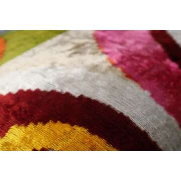Show more Introducing the Canvello Handmade Multi-Color Rainbow Silk Velvet Throw Pillow, a stunning fusion of luxury and comfort that elevates any living space. Measuring 16x24 inches, this exquisite decorative pillow is expertly crafted from premium silk velvet, ensuring a soft and sumptuous feel. The naturally vegetable-dyed fabric not only enhances its aesthetic appeal but also boasts impressive durability while being eco-friendly. With its vibrant rainbow-inspired geometric ikat pattern, this pillow is the perfect statement piece for your modern, bohemian, or eclectic décor.