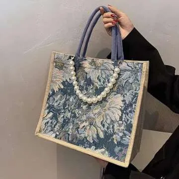 Caousino Canvas Tote Bags for Women, Reusable Large-capacity Bag Shopping Girl Fashion Print Shoulder Purse with Pearl Decoration - Washable, Foldable Handbag, Blue