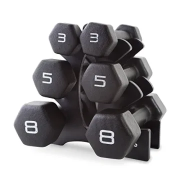 This set comes complete with a thoughtfully designed dumbbell storage rack that neatly holds weights of 3, 5, and 8 pounds. Perfectly tiered for easy accessibility, you can quickly switch between weights for a more efficient workout, whether you're lounging at home or taking your routine outdoors. The hexagonal shape of the dumbbells prevents them from rolling away, ensuring safety and ease of use when you need to take a break between sets.