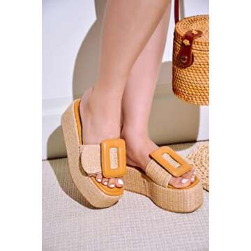 Show more Step into summer with the Cape Robbin Indi Platform Raffia Sandals, the perfect blend of style and comfort for the modern woman. These stunning chunky open-square-toe sandals are designed not only to be chic but also practical, featuring a slip-on style that makes dressing up or down a breeze. The natural raffia detailing exudes a casual elegance, ideal for any outing. Whether strolling down the beach or heading out to brunch with friends, these sandals promise to elevate your ensemble with a touch of effortless sophistication. With a balanced platform height, you won’t just look stylish; you’ll feel confident and comfortable all day long.