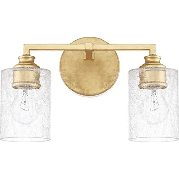 Show moreElevate your home decor with the captivating Capital Lighting 120521CG-422 Milan Iced Glass Bath Vanity Wall Mount. This exquisite vanity light blends sophisticated design with functional brilliance, making it an ideal addition to your bathroom or powder room. Adorned with a stunning capital gold finish that mimics the elegance of gold leaf, this fixture not only enhances the aesthetics of your space but also adds a touch of luxury that is bound to impress guests. The unique crackled glass shades create a beautiful interplay of light, casting enchanting shadows and adding a warm atmosphere to any setting.