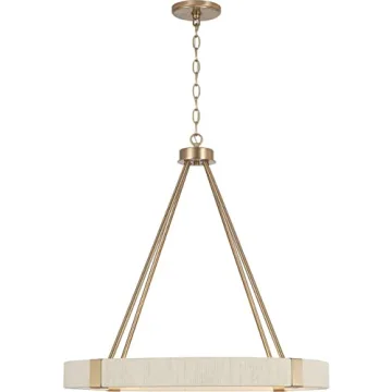 Show moreIlluminate your home with the stunning Capital Lighting 449841MA Delaney Modern Hand-Wrapped Rope Round Chandelier, a sophisticated lighting solution that adds both elegance and functionality to your space. Crafted with meticulous attention to detail, this chandelier measures 25.5 inches high and 26 inches wide, striking the perfect balance between size and design. With an impressive adjustable height of up to 151.5 inches, you can customize it to suit your room’s specifications, making it an ideal centerpiece for any setting, from cozy nooks to expansive dining areas.