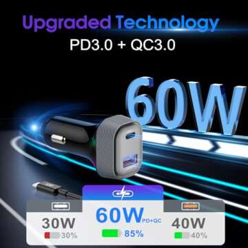 Car Charger 60W Super Fast Charging, QC3.0 USB C Car Phone Charger with 3.2ft PD 30W Type C Cable, 3 in 1 Car Adapter for iPhone 16/15/14/13Pro Max Plus Samsung Galaxy Google Pixel/Android Grey