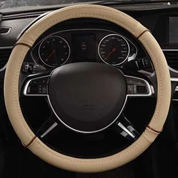 CAR PASS Line Rider Universal Fit Delux Leather Steering Wheel Cover, for suvs,sedans,Vans,Trucks for 14.7" to 15" (Beige)